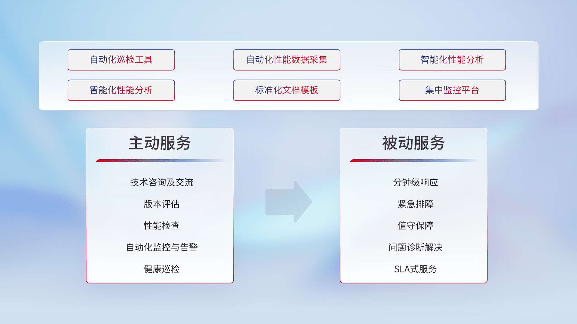智能化工具和标准化文档,,,,保障服务质量,,,提供主动服务(包含技术咨询、、、、版本评估、、性能检查、、自动化监控与告警、、健康巡检)和被动服务包含(分钟级响应、、、紧急排障、、、、值守保障、、问题诊断解决、、、、SLA服务)。。。